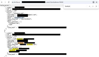 The database appeared to store keylogging and “infostealer” malware, a type of malicious software designed to silently harvest credentials from infected devices. These files were different from previous infostealer malware datasets that I have seen because it logged additional information. The records also included the “host_reversed path” formatted as (com.example.user.machine). This structure is used to create an easily indexable way to organize the stolen data by victim and source. Reversing the hostname can also help avoid directory conflicts or as an attempt to bypass basic detection rules that look for standard domain formats. The system used a line hash as the document ID to ensure one unique record per unique log line. In a limited search of these hash and document IDs it was identified that they were indeed unique and returned no duplicates.